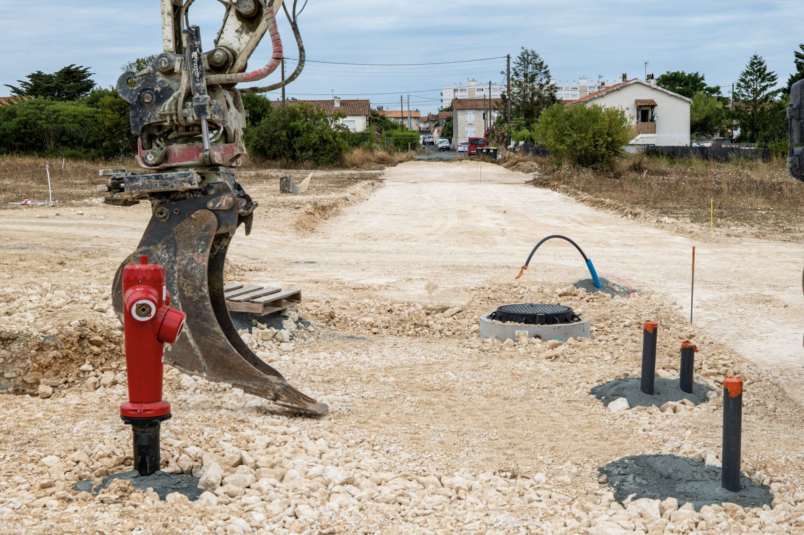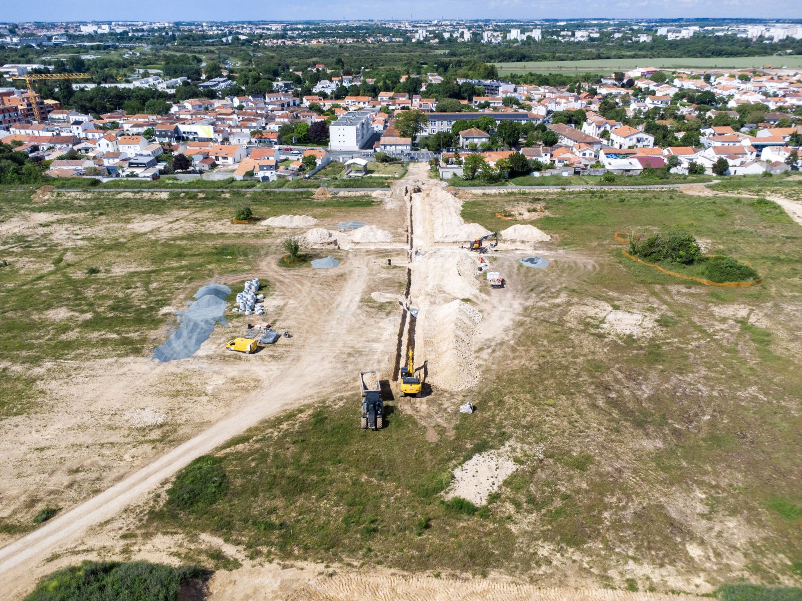 Les travaux de terrassement tracent les voies qui prolongeront les rues de la cité Pierre Semard. Les derniers réseaux sont enfouis le long du chemin des écoliers, qui reliera l’avenue Roger-Salengro et le Jardin des Phacélies au parc public (juillet 2025 © Eric Houdbine).