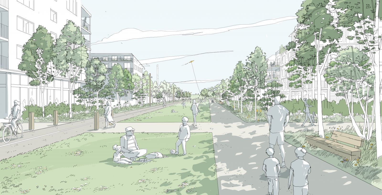 Perspective vers le parc urbain depuis le chemin des Écoliers - © L’Œil du Pigeon.