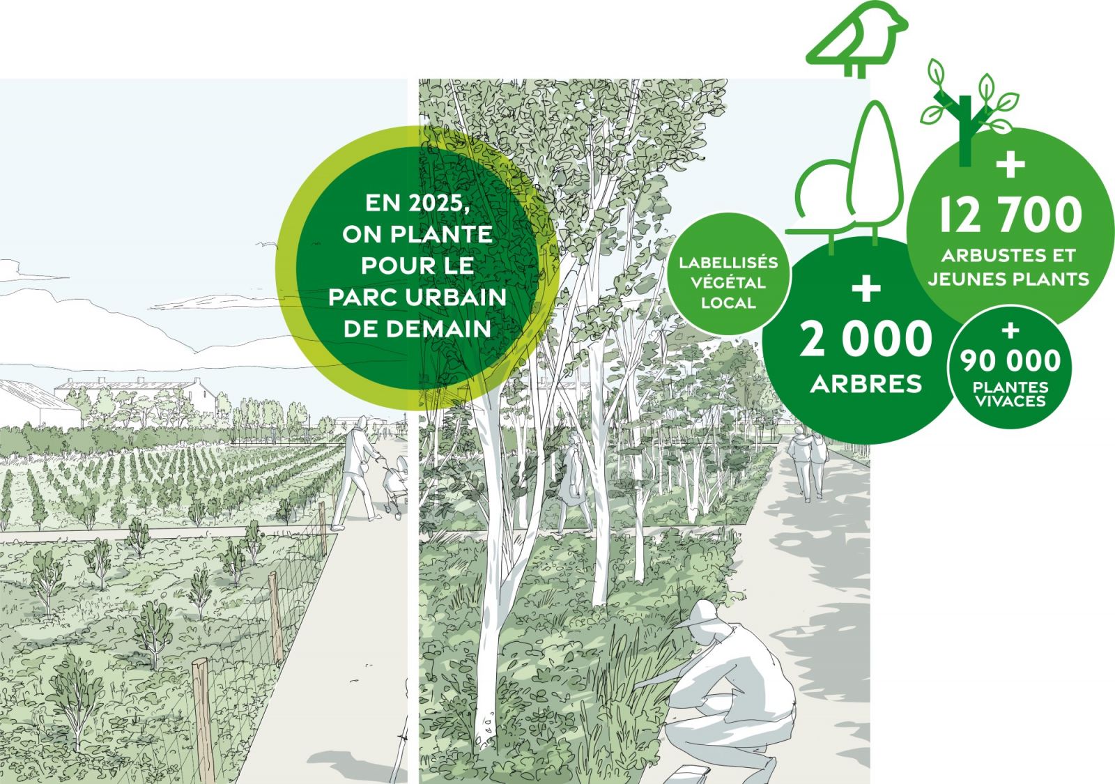 La dépollution de cette ancienne friche ferroviaire a nécessité la mise à nu des sols sur une large emprise. Un processus de reconstitution et de renaturation de ces sols est depuis mis en œuvre. Il consiste à réemployer des terres végétales issues d’autres chantiers (situés à moins de 30 km) là où ce sera nécessaire et à les enrichir de façon naturelle via des plantations. Les eaux pluviales y seront gérées à ciel ouvert via un réseau de noues, au bénéfice de l’arrosage naturel des végétaux. Les espèces ont été soigneusement sélectionnées pour s’adapter aux caractéristiques du sol et offrir le gîte comme le couvert aux oiseaux. Les arbres, les jeunes plants d’arbres et d’arbustes ainsi que les vivaces sont tous labellisés « végétal local ». Certains seront plantés cet hiver avec les citoyennes et citoyens dans le cadre du projet Forêt bleue de la Coopérative Carbone. 5 continuités écologiques se verront ainsi renforcées et un suivi sur plusieurs années est programmé pour s’en assurer.