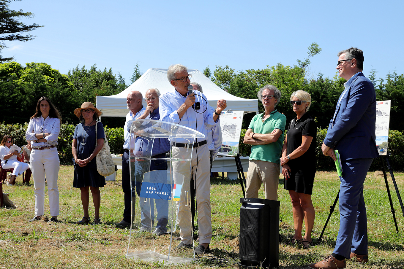 Julie Fabre de l'agence d'architecture Fabre de Marien, maître d'oeuvre du projet, Jean-Luc Gorce, directeur général d’aquitanis et Philippe de Gonneville, Maire de Lège-Cap Ferret.